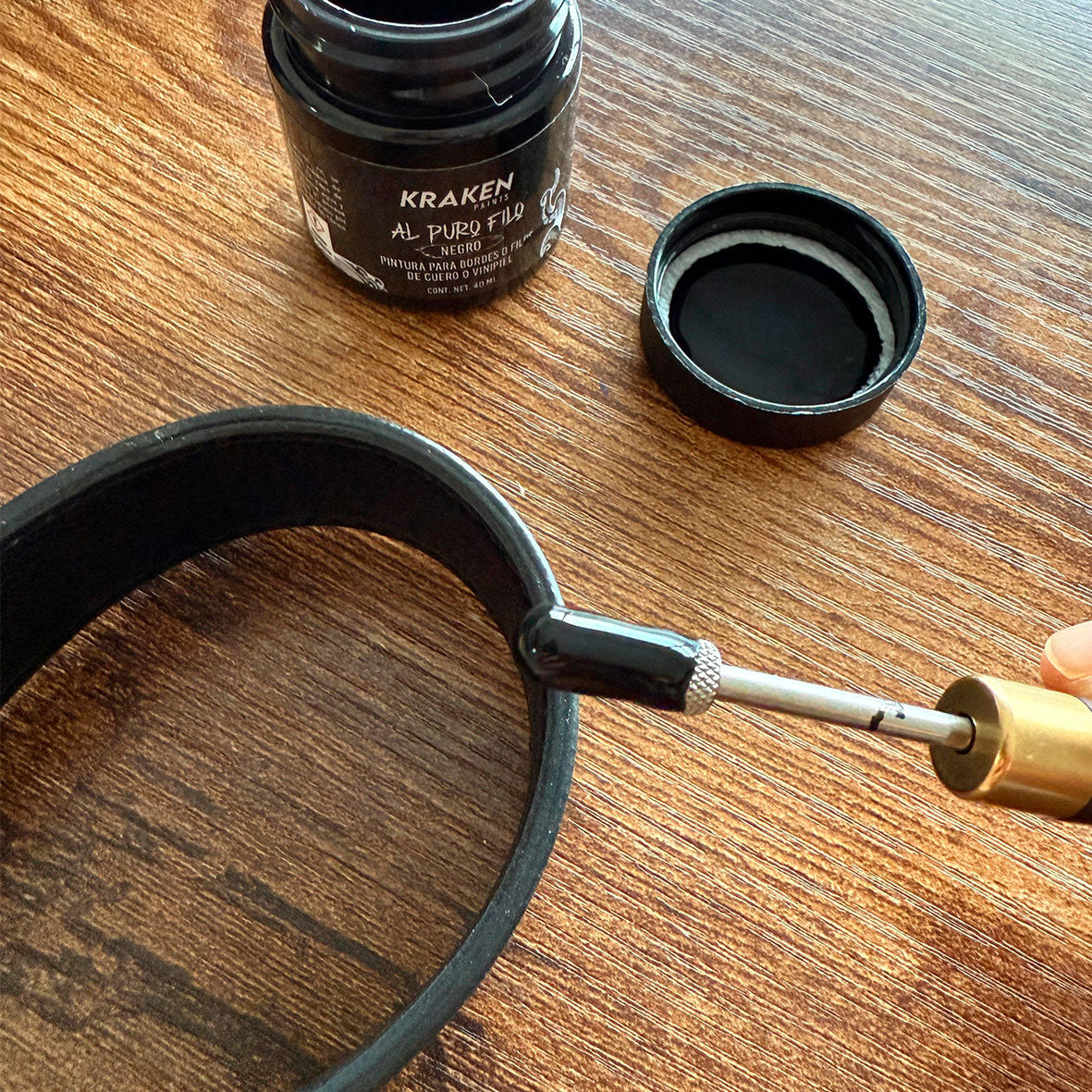 Tome un poco de pintura y aplique sobre el borde del cuero o vinipiel.